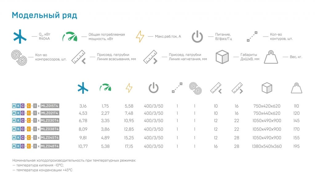 Стоит отметить их универсальность – они предназначены для использования в различных системах промышленного охлаждения и технологического кондиционирования воздуха. Модельный ряд включает в себя низко-, средне- и высокотемпературные агрегаты для работы на хладагенте R404a.