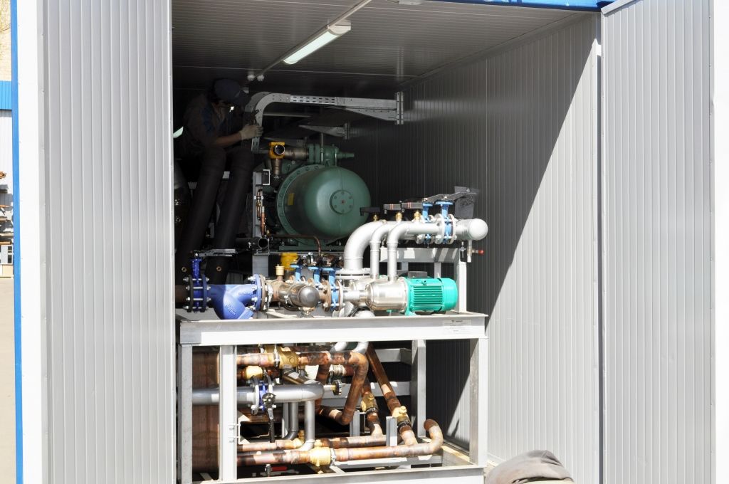 Весомым аргументом для Заказчиков при выборе ГК «ТЕРМОКУЛ» в качестве подрядчика или поставщика оборудования, является наличие у компании собственной мощной производственной базы. Это позволяет, с одной стороны, значительно повысить вариативность технических решений для того или иного вида ледовых катков, а с другой стороны, унифицировать производственный процесс, что всегда связано с повышением качества выпускаемого оборудования. Это позволило компании в последние годы разработать, изготовить и применить на ряде объектов агрегатированную холодильную систему контейнерного типа для холодоснабжения ледовых арен, которая показала себя в процессе эксплуатации с самой лучшей стороны. Такая система не только значительно сокращает сроки ввода объектов, но и обладает преимуществом перед другими стационарными системами, поскольку ее можно применять в условиях ограниченных площадей. Производимая ГК «ТЕРМОКУЛ» холодильная система контейнерного типа холодопроизводительностью до 430 кВт способна обеспечить функционирование ледовых полей стандартных размеров (60 х 30; 56 х 28) поддерживания температурные режимы в диапазоне от -9 до -12 0С.