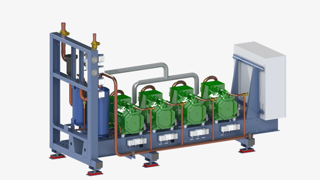 В базовый состав холодильной централи входят от двух до пяти поршневых полугерметичных компрессоров Bitzer с встроенным электродвигателем, который оснащен реле защиты от перегрева обмоток, ограничители давления для каждого компрессора, линия всасывания и нагнетания с фильтрами, реле давления, отделитель и ресивер масла, электронные регуляторы уровня масла (на каждый компрессор) и некоторые других компоненты, позволяющие оптимизировать работу холодильной централи в различных режимах работы.