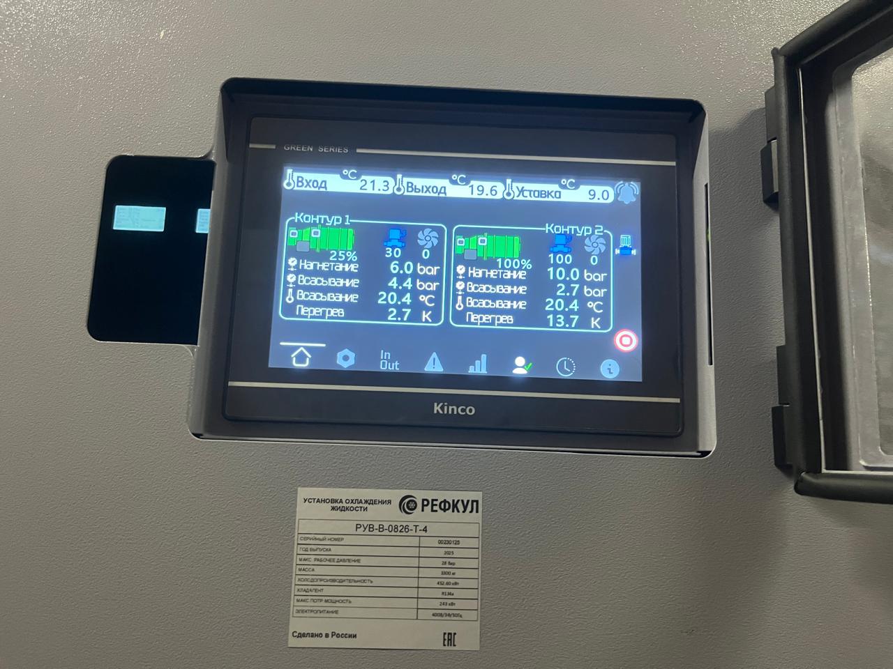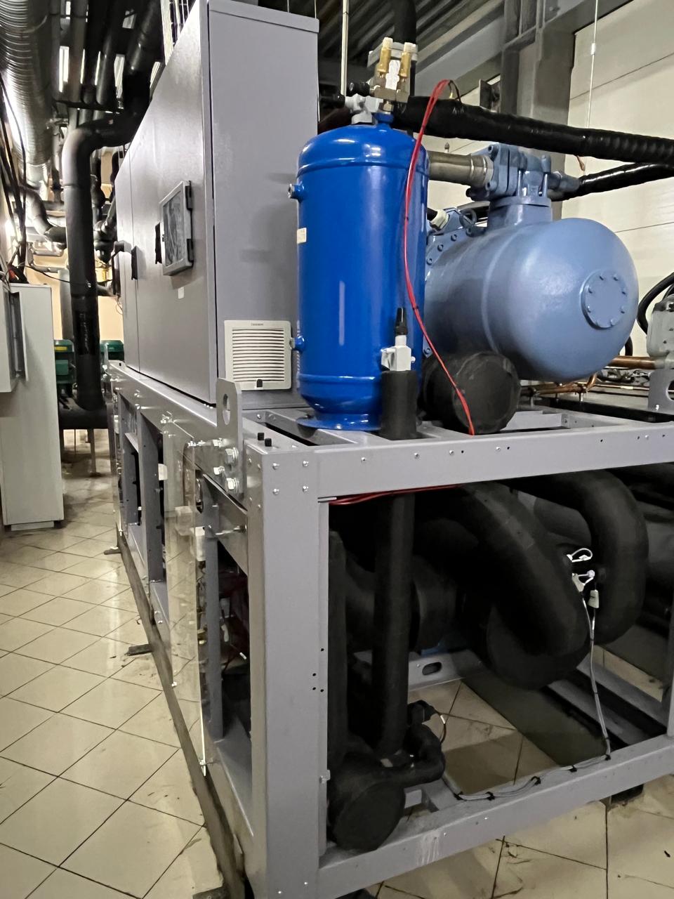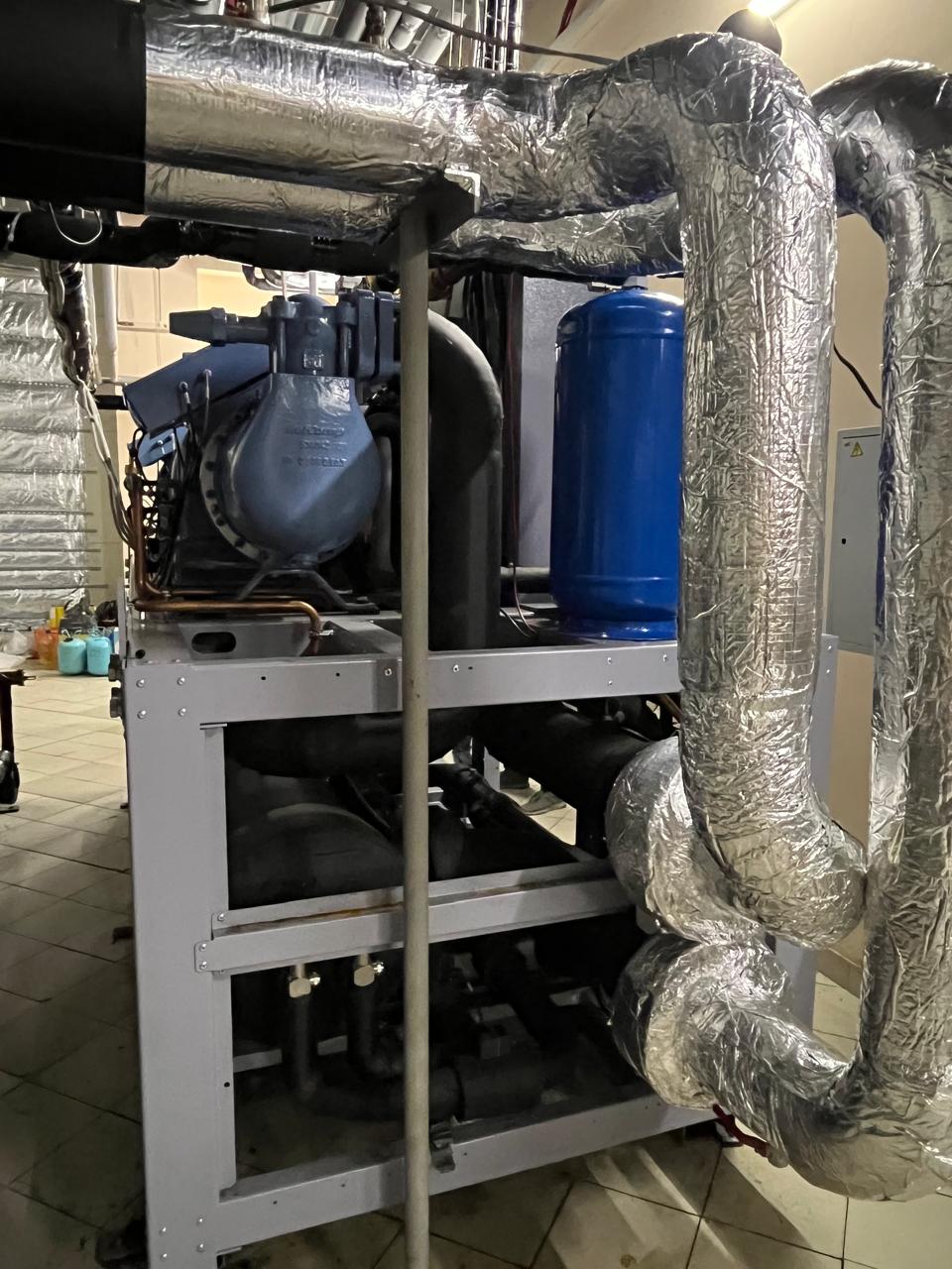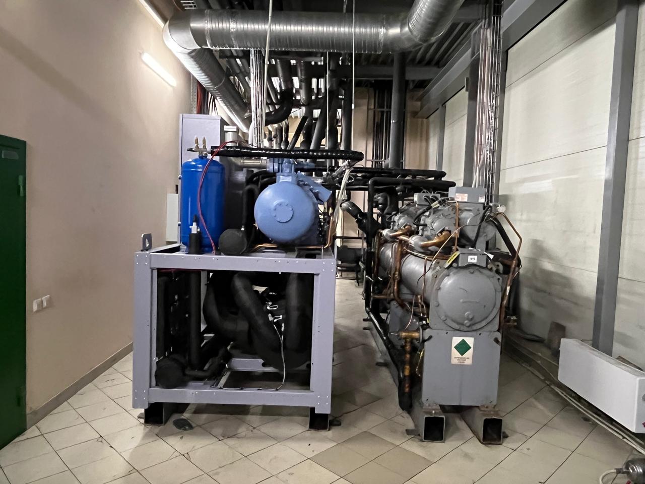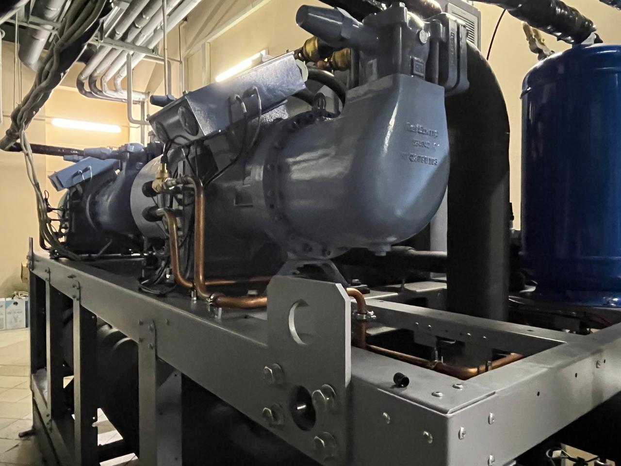 Взамен устаревшего агрегата «TRANE» был установлен новый чиллер с выносным конденсатором, работающий на базе винтовых компрессоров холодопроизводительностью 452 кВт. Модель РУВ-В-0826-T-4. Выбор винтовых компрессоров обоснован их высокой надежностью, энергоэффективностью и возможностью стабильной работы при значительных нагрузках.