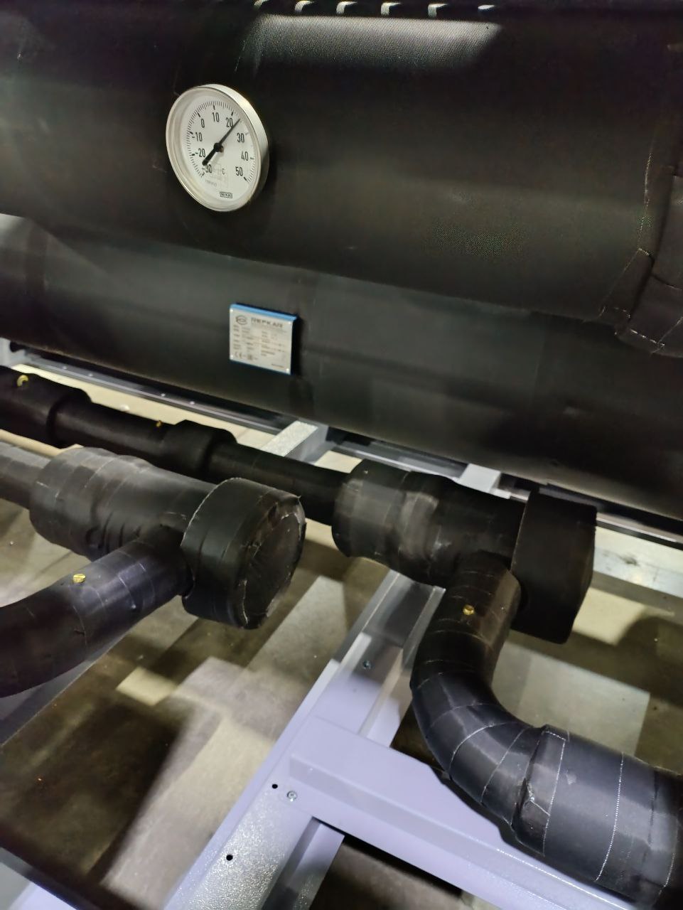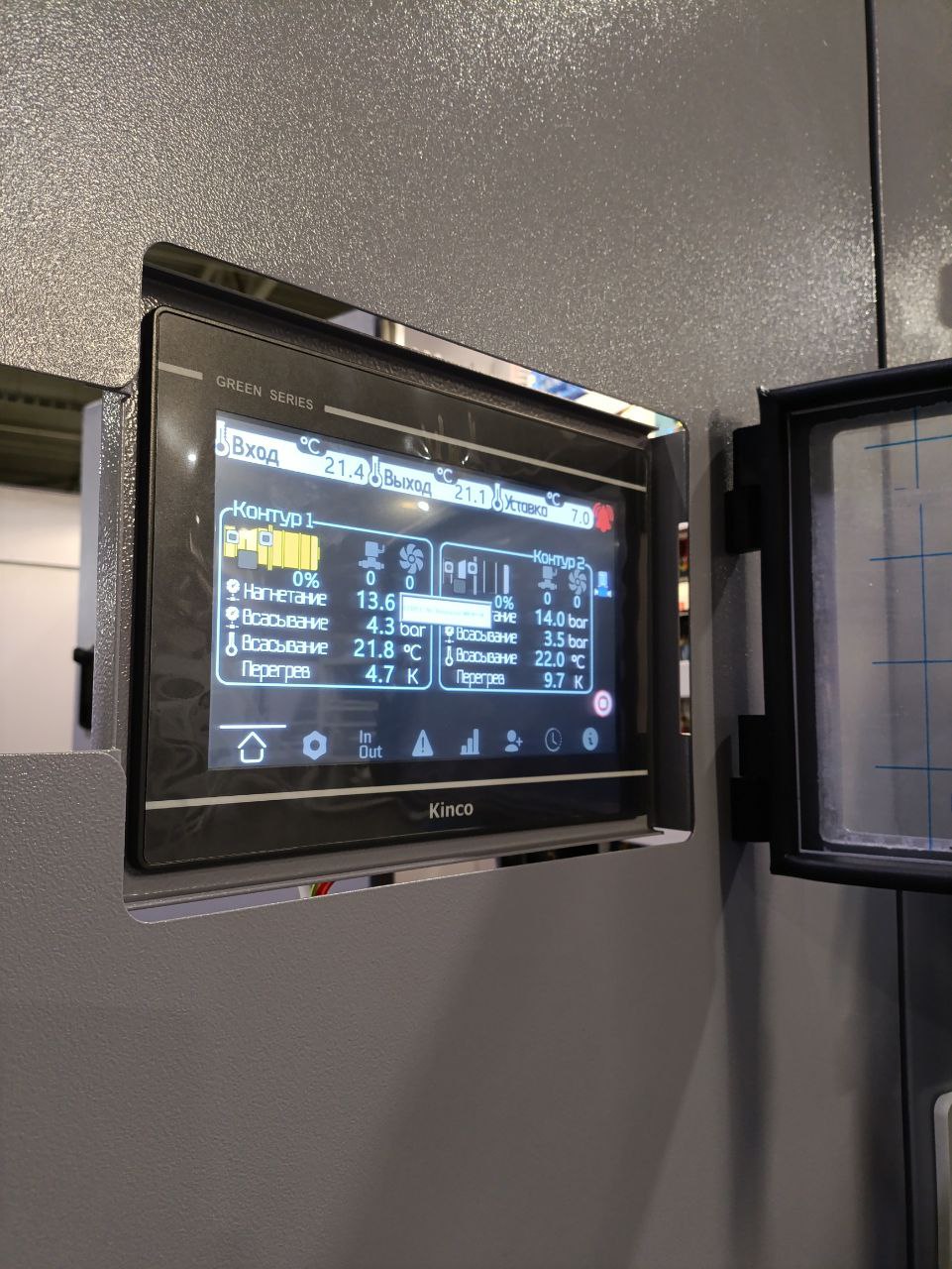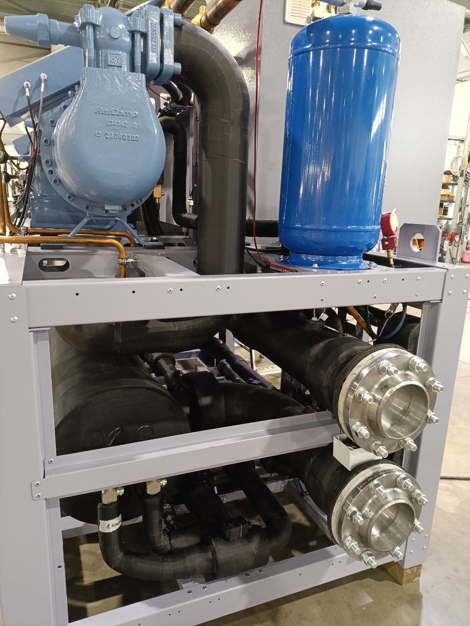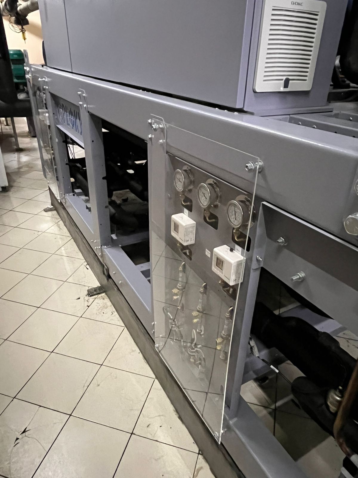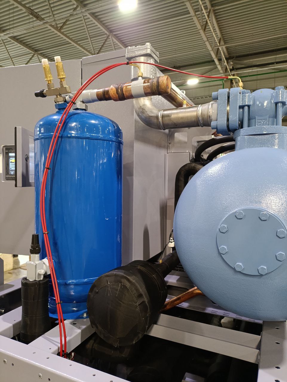 Взамен устаревшего агрегата «TRANE» был установлен новый чиллер с выносным конденсатором, работающий на базе винтовых компрессоров холодопроизводительностью 452 кВт. Модель РУВ-В-0826-T-4. Выбор винтовых компрессоров обоснован их высокой надежностью, энергоэффективностью и возможностью стабильной работы при значительных нагрузках.