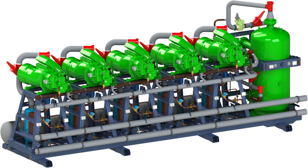 В базовый состав многокомпрессорных агрегатов входит от двух до пяти полугерметичных винтовых компрессоров ведущего мирового производителя BITZER, каждый из которых оснащен электронным устройством защиты электродвигателя (контроль температуры обмоток, направление вращения, симметрия и пропадание фазы, задержка повторного пуска). Компрессор также оснащен датчиком для защиты от повышенной температуры нагнетания, встроенным перепускным клапаном, встроенным обратным клапаном, двумя электромагнитными клапанами для регулировки производительности и разгрузки старта, запорными вентилями на всасывании и нагнетании.