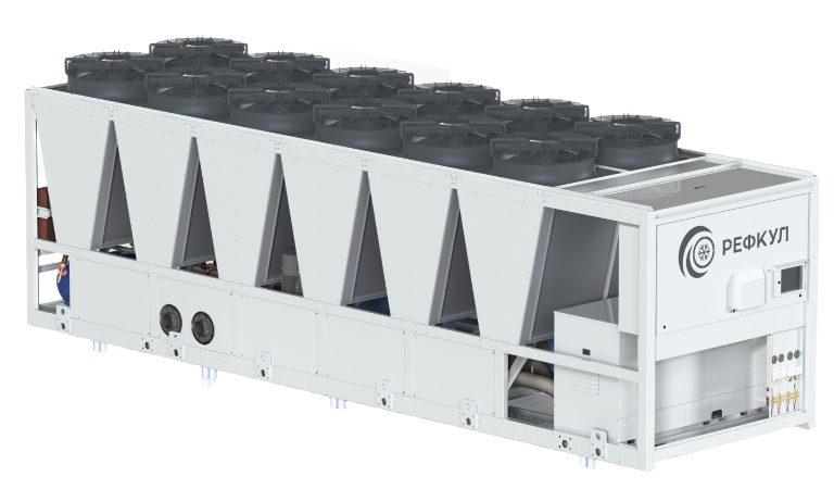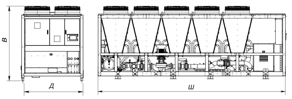 Драйкулер: микроканальный или трубчато-ребристый, теплообменные блоки, устанавливаемые параллельно конденсаторным блокам V-образно попарно, продуваемые общими с конденсатором вентиляторами.