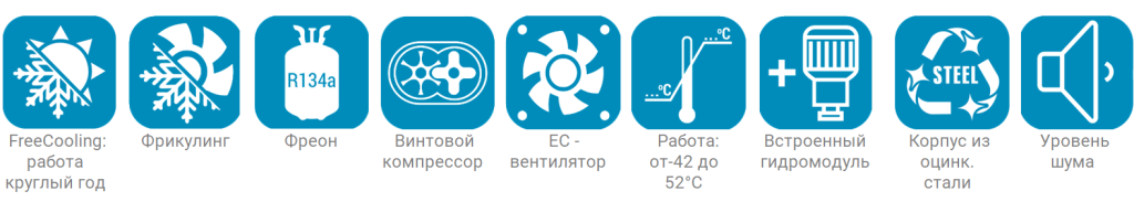 - Встроенный НТК до −40˚С (для всех чиллеров на R134a и чиллеров до 100 кВт на R410A). В составе: регулятор давления конденсации, ресивер с группой безопасности и запорными кранами, обратный клапан (не применяется для чиллеров с ФК)