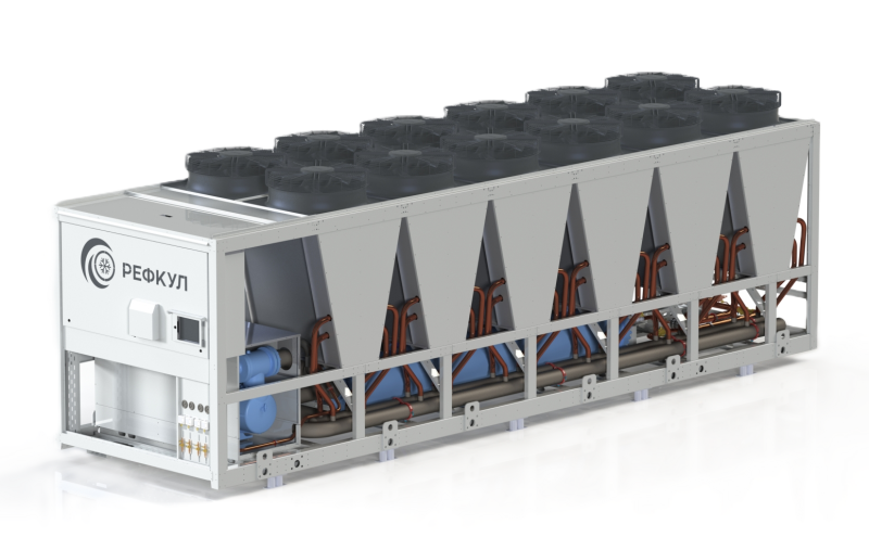 - Встроенный НТК до −40˚С (для всех чиллеров на R134a и чиллеров до 100 кВт на R410A). В составе: регулятор давления конденсации, ресивер с группой безопасности и запорными кранами, обратный клапан (не применяется для чиллеров с ФК)